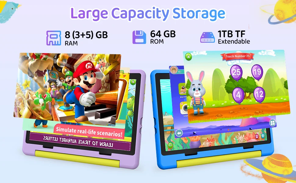 ?Grande memória e extensão?8 GB de memória atual com 64 GB de espaço de armazenamento, podem garantir que o tablet execute várias aplicações sem problemas e não será o fenômeno caton devido à falta de memória.Ao mesmo tempo, o suporte estendido do cartão TF de 1 TB oferece muito espaço para as crianças armazenarem muitos materiais de aprendizagem, fotos, vídeos, etc., para atender às necessidades das crianças de uso a longo prazo.